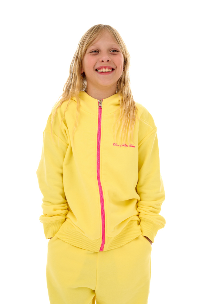 Детская толстовка в оттенке "банановый шейк" с ярким розовым принтом и контрастной молнией.