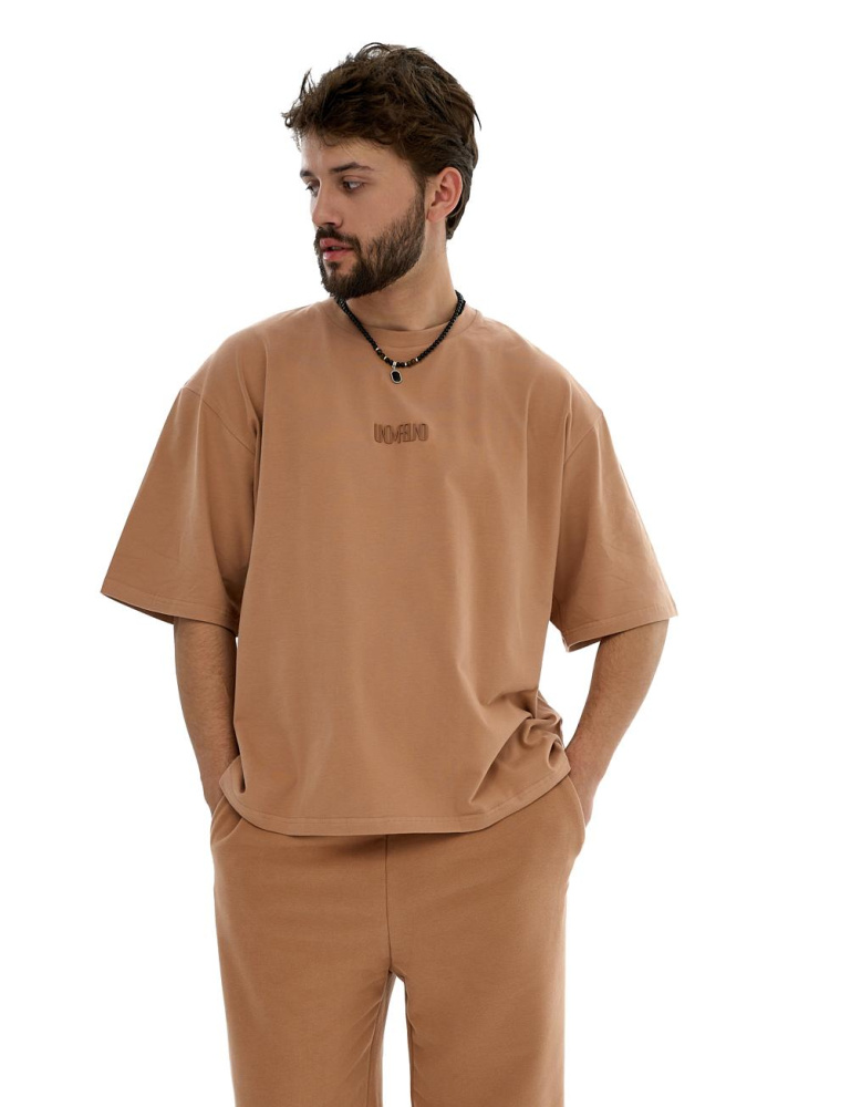 Футболка в приятном мускатном оттенке с велюр эффектом и выпуклым логотипом.