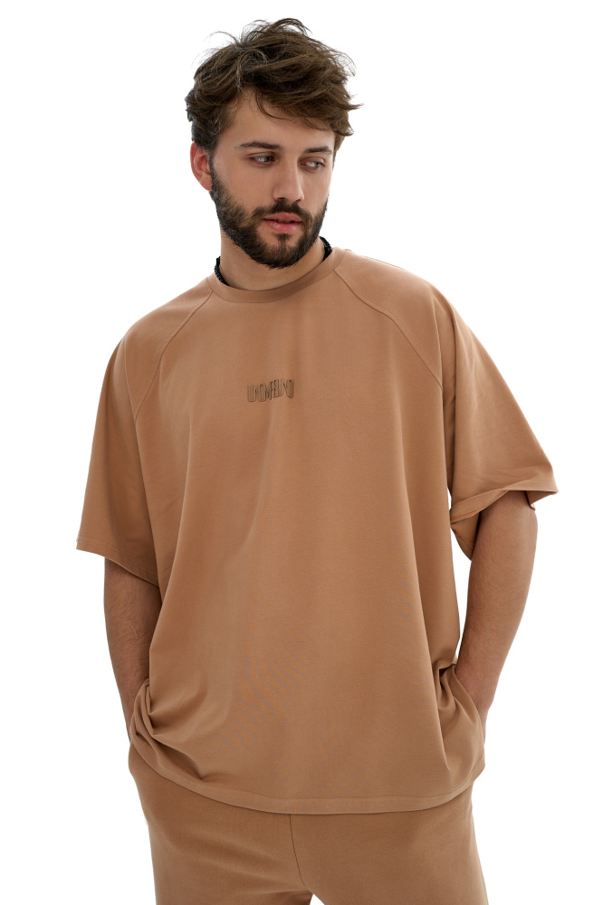 Футболка с велюр эффектом и выпуклым логотипом. Особенность модели "овер" - рукав реглан.