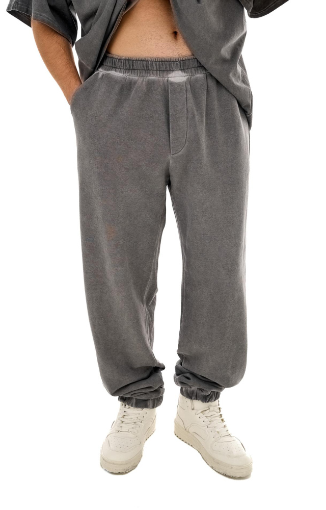 Джоггеры с эффектом "вытравка" - изначально белое изделие окрашивается в нужный цвет. Отличается характерными белыми швами. Серый логотип в цвет на штанине.