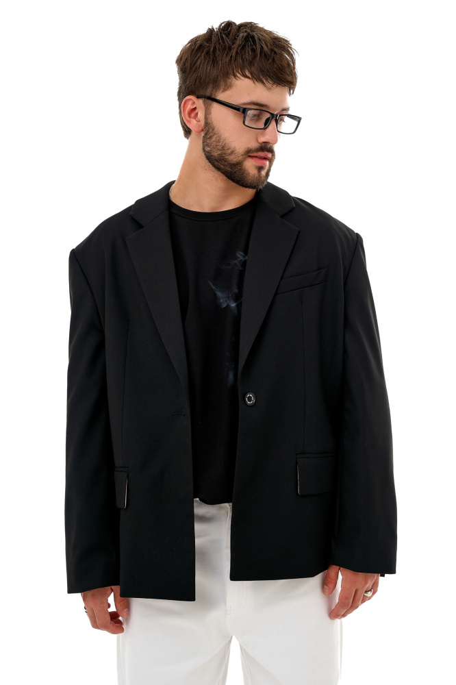 Жакет в черном цвете умеренного объема и увеличенной линией плеча.