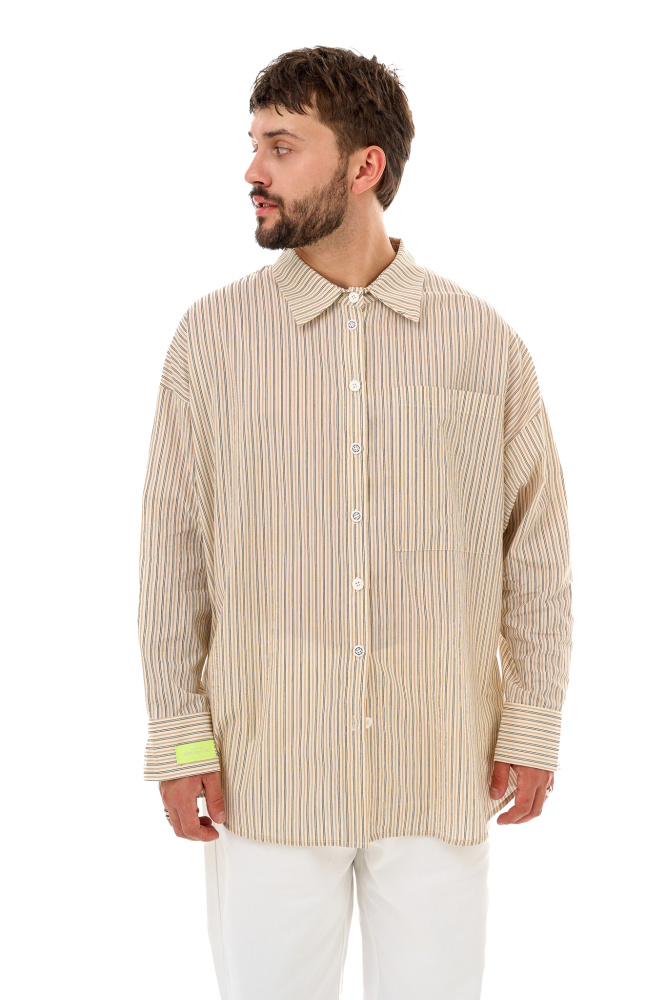 Наша базовая оверсайз рубашка из мягкого хлопка в бежево-кофейную полоску.
