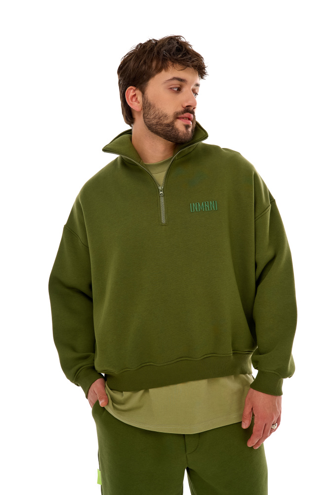 Свитшот Халфзип в приятном оттенке "хаки" с начёсом и выпуклым логотипом UNO MAS UNO на груди. Свитшот отлично сочетается с брюками, не только со спортивными джоггерами.