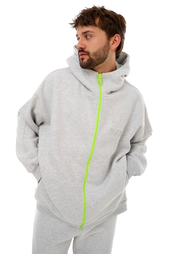 Толстовка оверсайз посадки с выпуклым логотипом на груди и контрастной молнией.