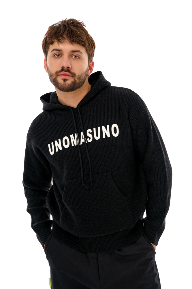 Трикотажный вязаный худи с выпуклым резиновым логотипом UNO MAS UNO на груди.