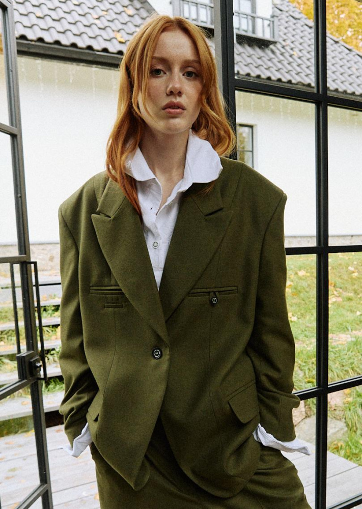 Жакет с множеством многофункциональных карманов из шерсти в оливковом оттенке. Можно сочетать с брюками в цвет или с джинсами.