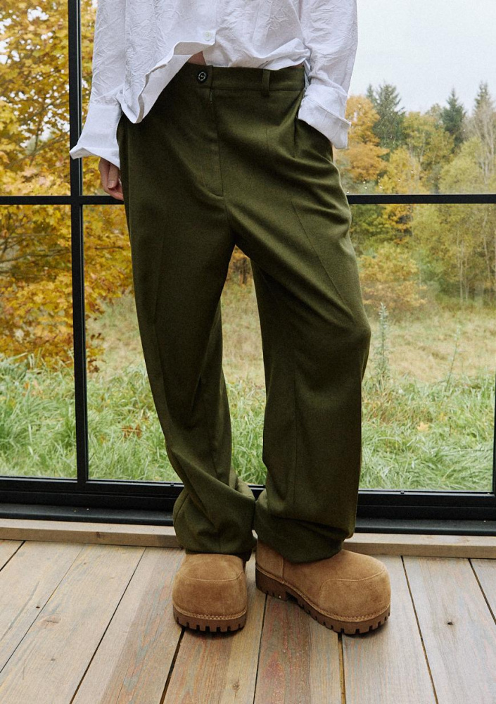 Брюки из шерсти в оливковом оттенке прямого кроя и свободной посадки. Отлично сочетаются со спортивной и классической обувью.