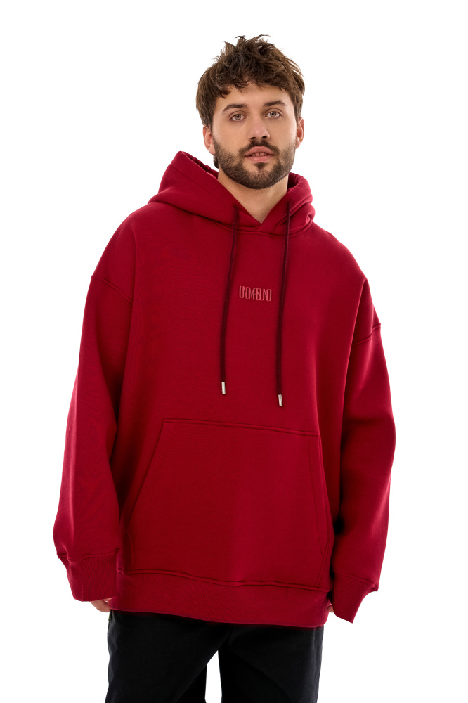 Худи с начесом в винном оттенке со шнурками, карманом и выпуклым логотипом.