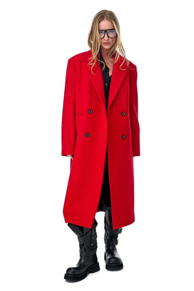 Прямое пальто умеренного объема из итальянской шерсти в приятном красном цвете.