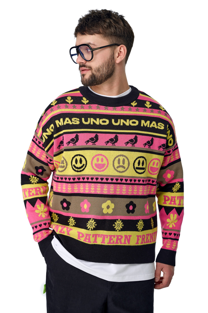 конечно же, в джемпере зашиты "пасхалки" - белорусские символы богатства и зарождающейся любви. Надпись Frenzy Pattern - безумный рисунок и номер 19 на спине (год основания бренда).