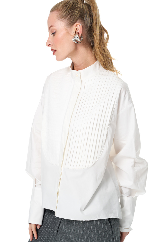 Удлиненная рубашка с гофрированной манишкой с необработанным краем.