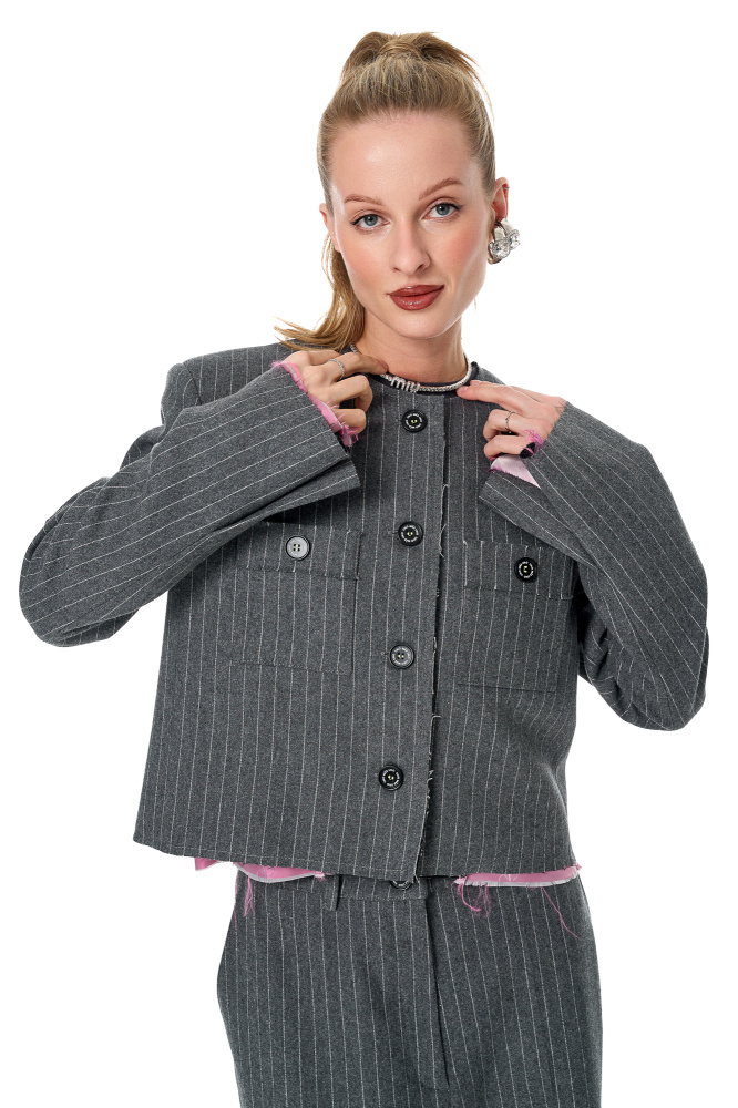 Укороченный жакет из шерсти с необработанным краем. Можно носить в сочетании с брюками из такой же ткани, а также джинсами, и даже джоггерами.