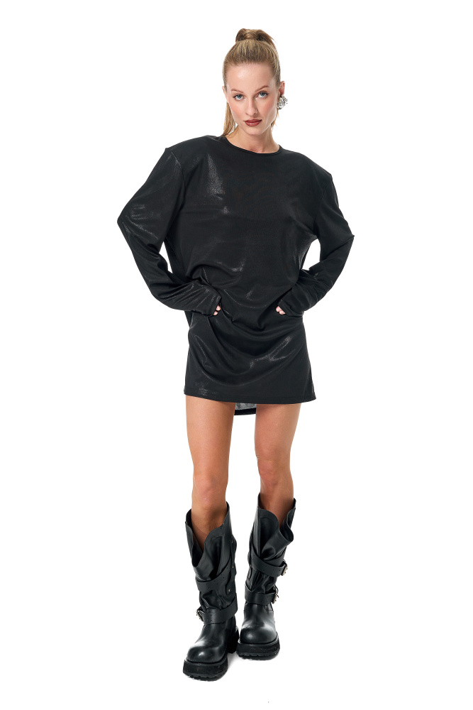 Платье прямого кроя с увеличенной линией плеча. Благодаря мелкой металлизированной нити ткань создает мокрый эффект. Добавляйте пояс или ремень для создания другого силуэта. Платье можно сочетать не только с элегантной обувью, но и грубыми сапогами и ботинками.
