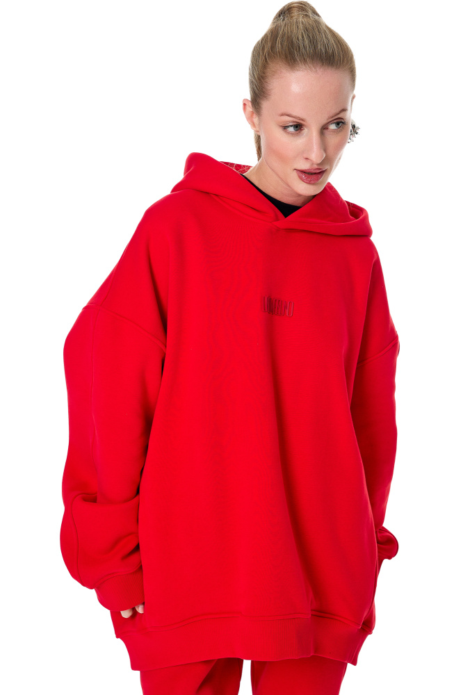 Худи с начёсом-плюш в ярком красном цвете с выпуклым слитным логотипом UNO MAS UNO.