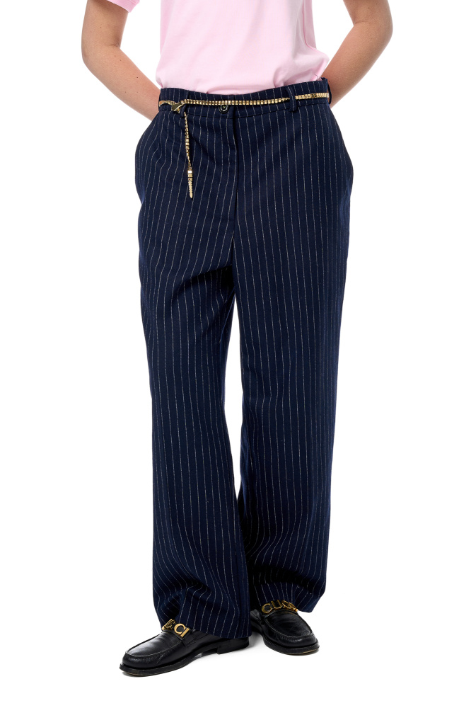 Брюки из шерсти в синем оттенке в полоску немного заниженной посадки.