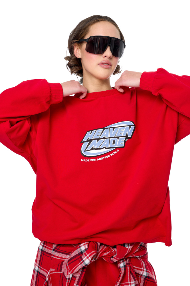 Лонгслив с манжетами в приятном красном оттенке с велюр эффектом с новом принтом Heaven Made (Создан на Небесах), Made for another world (Создан для другого мира).