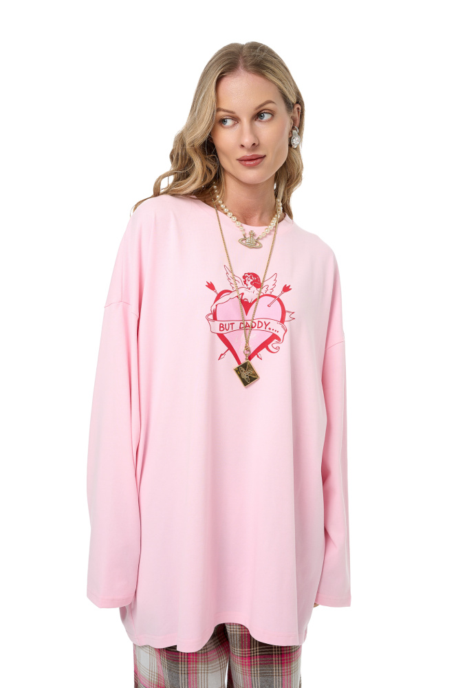 Лонгслив оверсайз посадки нежно-розового оттенка с принтом в ретро стиле But Daddy, I love him (Но папочка, я люблю его!).