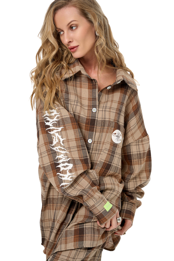 Рубашка в шоколадную клетку с принтами надписей UNO MAS UNO в стиле The Prodigy и готическом.