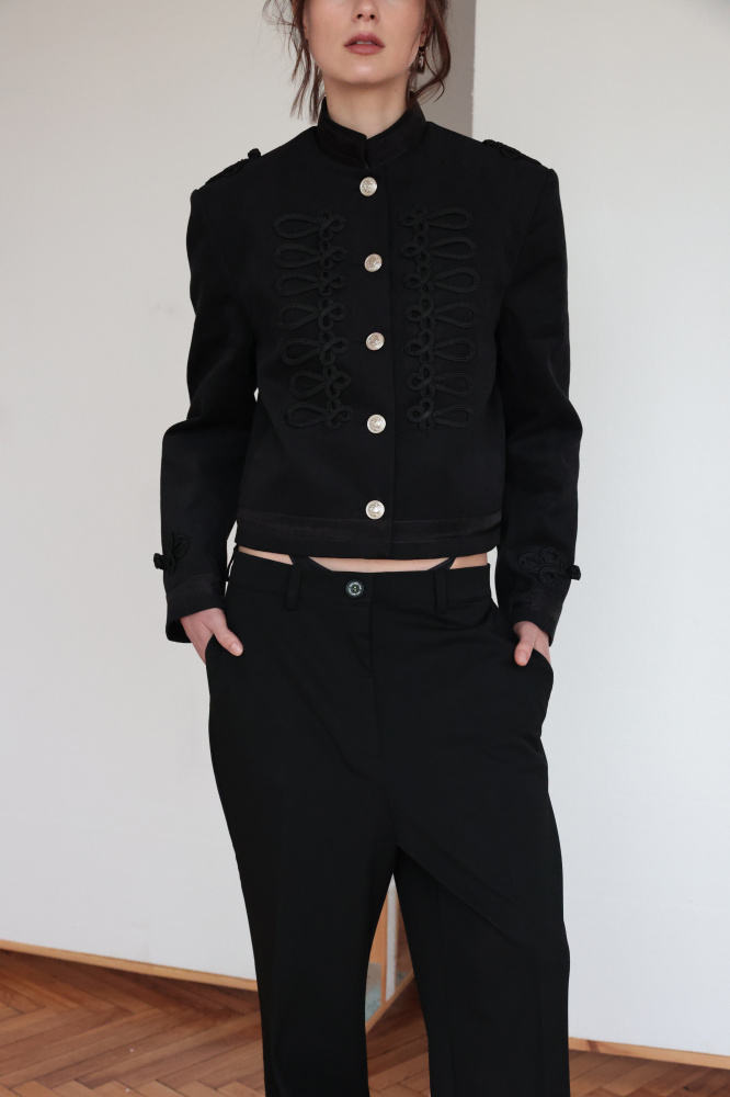 Новый драматичный силуэт. Исторический крой встречается с актуальной посадкой: витиеватые черные шнуры, четкие линии плеч и подчеркнутая талия превращают жакет в универсальный инструмент гардероба.