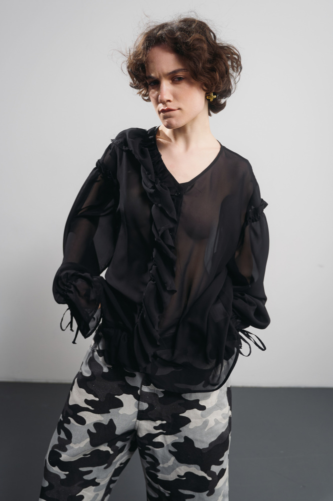 Летящий полиэстер создаёт эффект дымки, а деликатная фактура добавляет образу воздушности. Блузка максимально гармонична как самостоятельный айтем и удачно работает в многослойных образах.