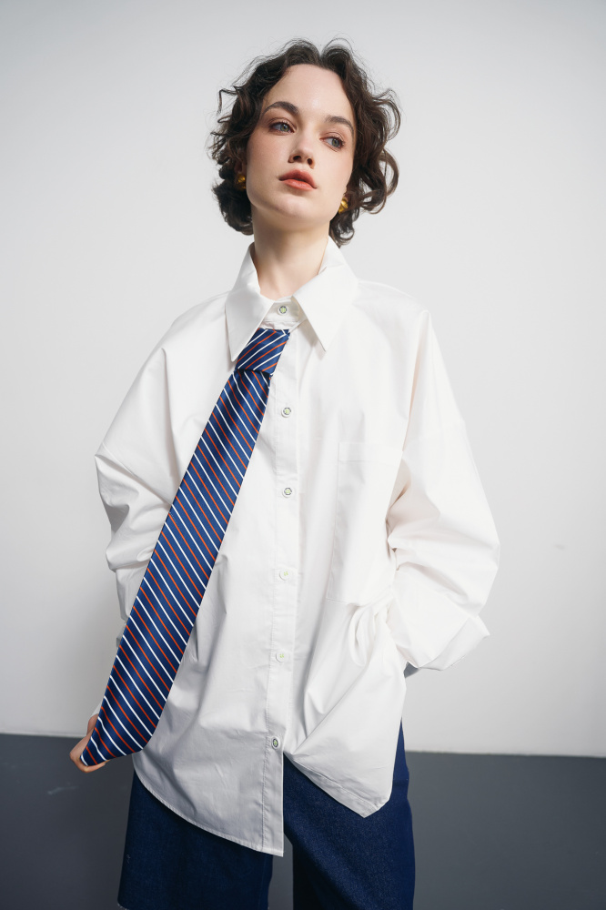 Рубашка из коллаборации Uno Mas Uno x 1664. Свободный крой, спокойные плечи и главная деталь — съёмный акцентный галстук.