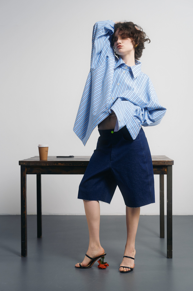Рубашка из коллаборации Uno Mas Uno x 1664. Двусторонняя оверсайз-модель: клетка с одной стороны, спокойная полоска — с другой. Сине-голубая палитра работает на любой фактуре.
