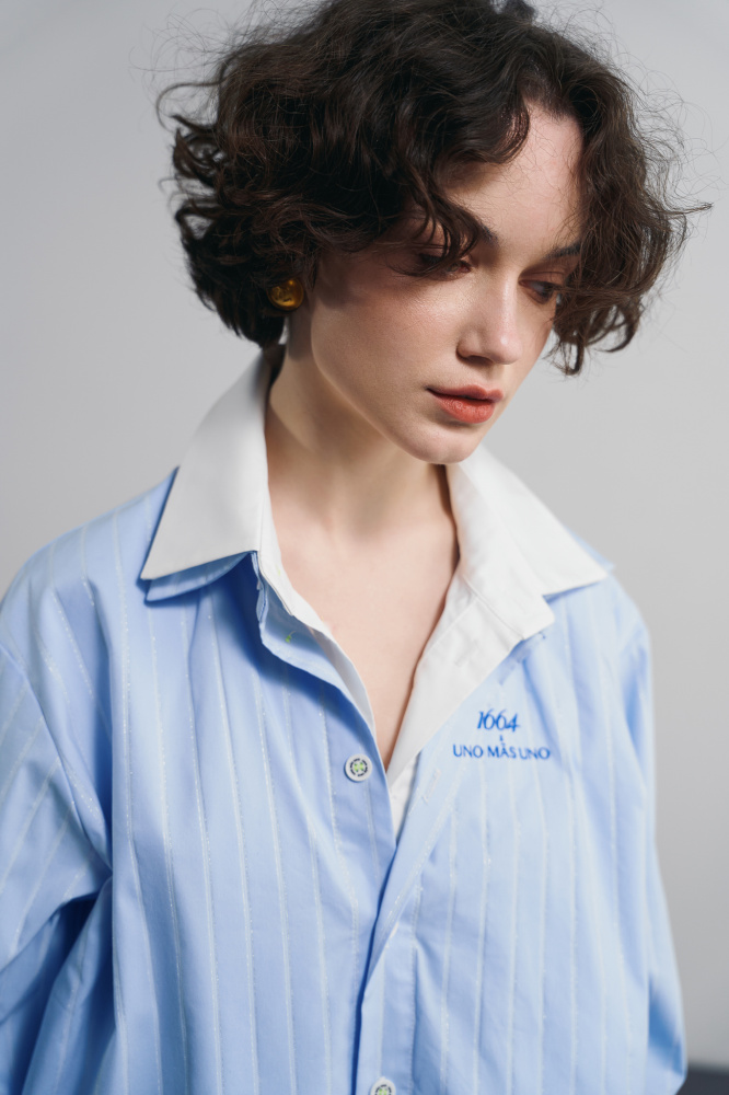 Рубашка из коллаборации Uno Mas Uno x 1664. Двойной воротник добавляет архитектуры и объёма, а деликатная вышивка работает как акцент.