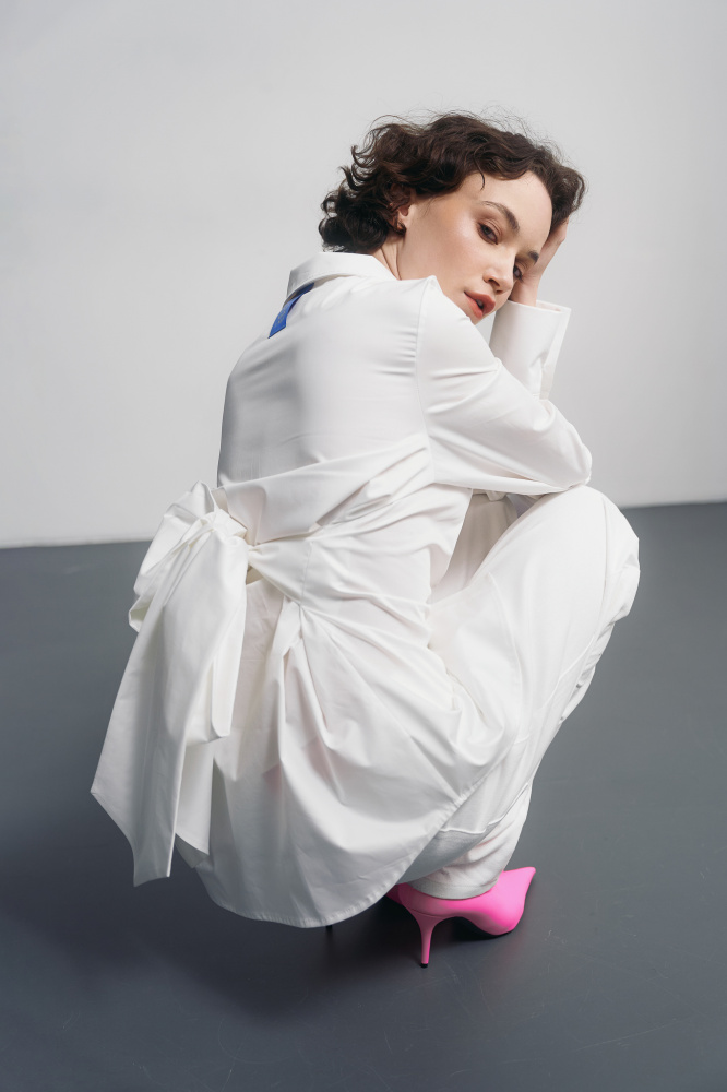 Рубашка из коллаборации Uno Mas Uno x 1664. Пояс фиксируется в плотный, объёмный бант — держит форму, не распадается и выглядит как самостоятельное украшение. Силуэт зависит от варианта стилизации пояса: приталенный или свободный.