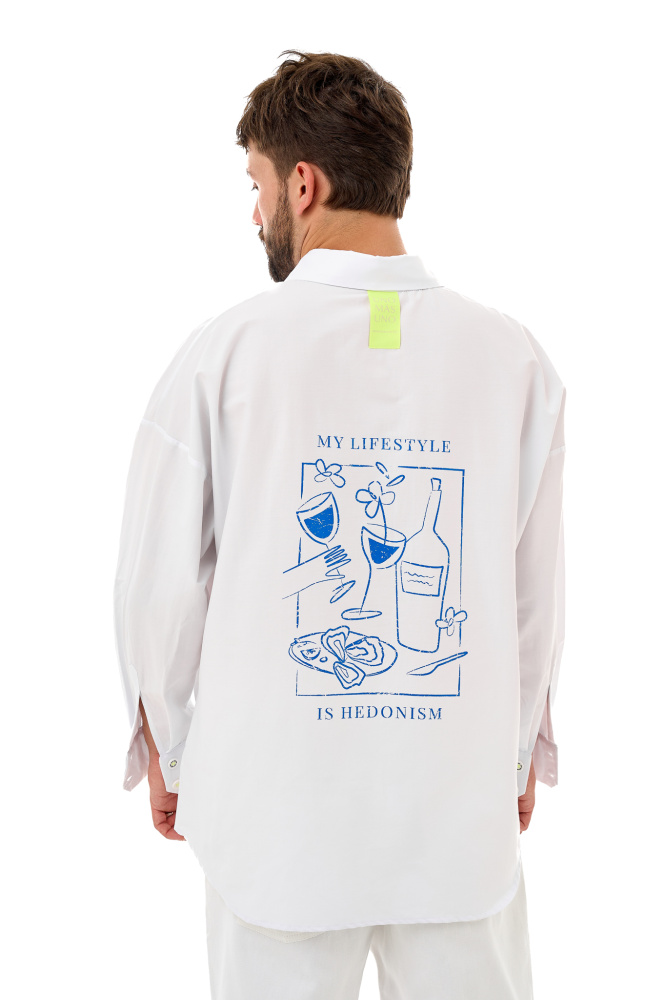 Рубашка оверсайз посадки с новым принтом на спине My lifestyle is gedonism.