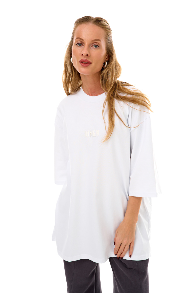 Белая минималистичная футболка с выпуклым логотипом.