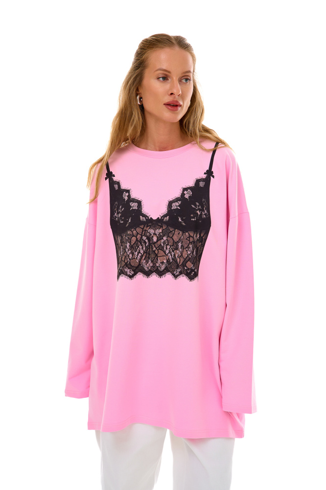 Лонгслив в нежно-розовом оттенке с принтом кружевного топа, где на бантиках написано UNO.