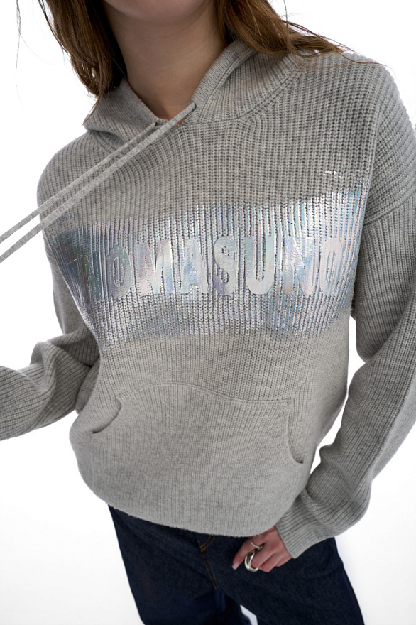 - С капюшоном — удобные модели, сочетающие стиль свитера и практичность худи. Особенность линейки — металлизированные изделия «Фольга» с эффектом блеска.