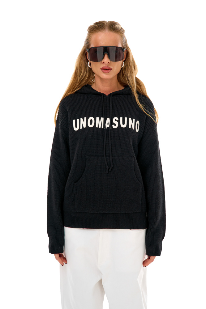 Трикотажный вязаный худи с выпуклым резиновым логотипом UNO MAS UNO на груди.