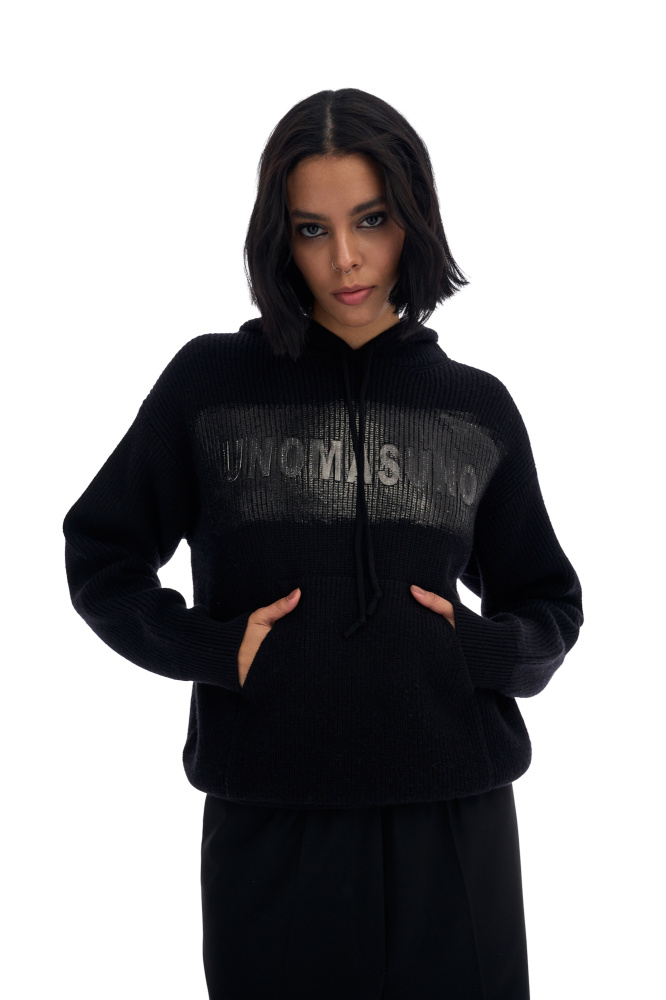 Джемпер с капюшоном из шерсти с фольгой на логотипе. Фольга нанесена вручную и с каждой стиркой будет понемногу стираться - вещь становится именно вашей :)