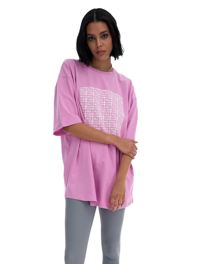 Футболка в розово-фиолетовом оттенке с принтом в виде квадрата из надписей UNO MAS UNO и смайликов. С велюр эффектом.