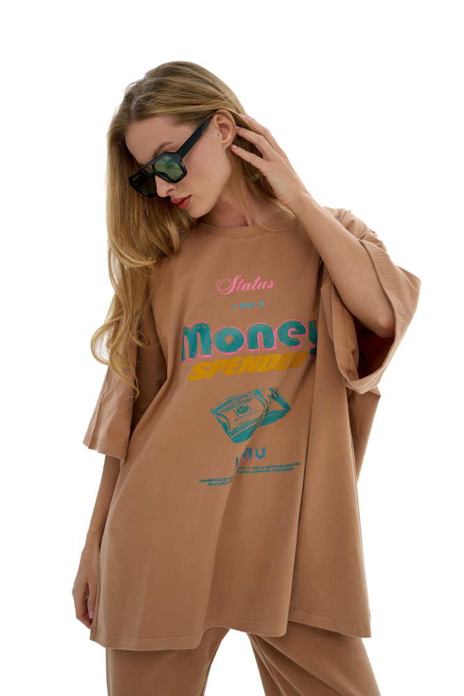 Футболка в модели "овер" с рукавом "реглан" - в мускатном оттенке с принтом Money Spender - для настоящих транжир :)