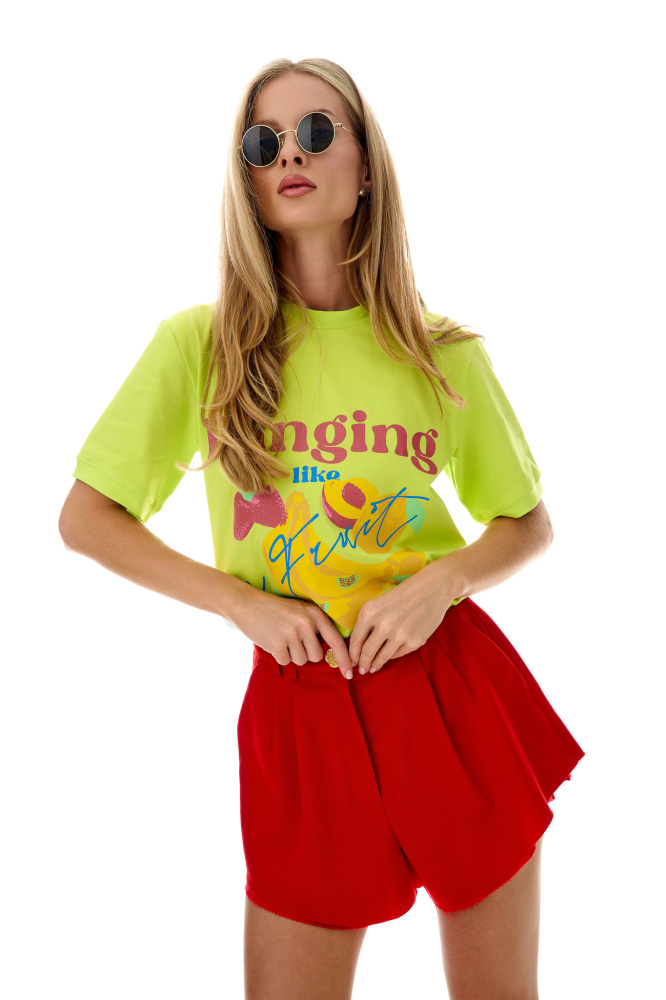 Футболка полуоблегающего силуэта с новым принтом "Фрукты".