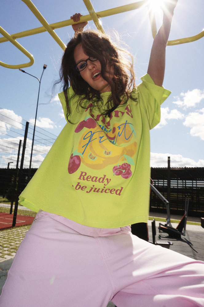 Футболка в лаймовом оттенке с новым принтом "Фрукты".