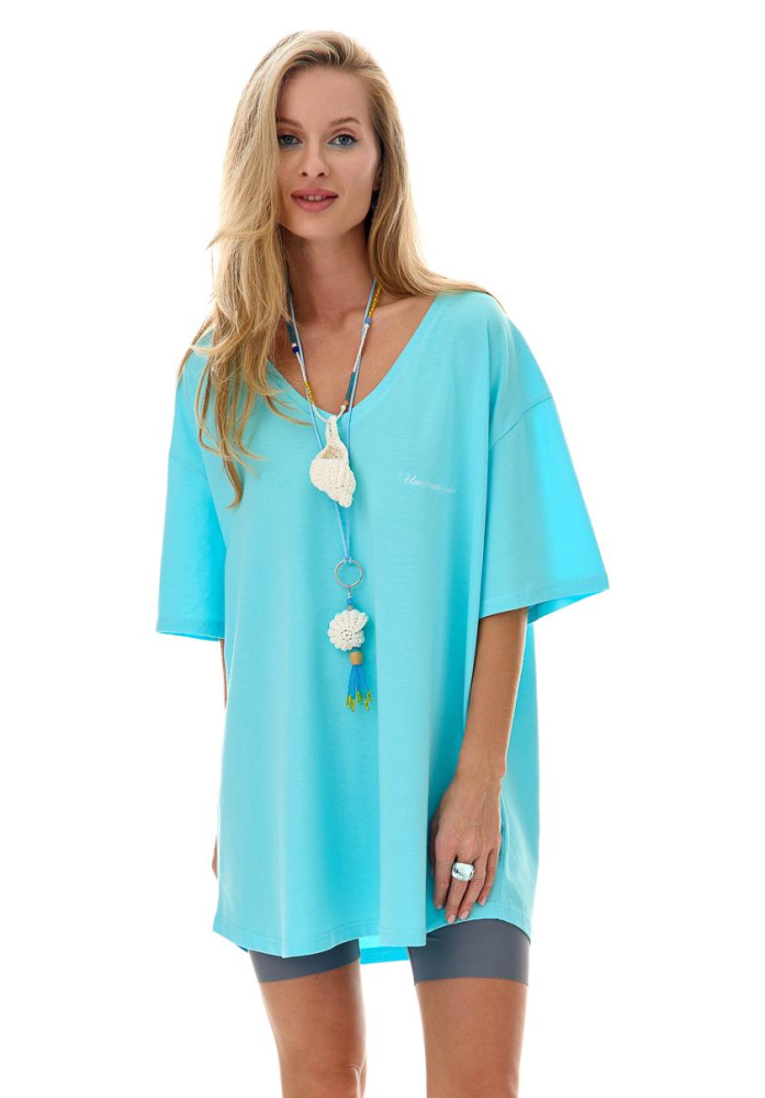 Футболка с глубоким V вырезом в приятном оттенке "тиффани", на груди - белая вышивка UNO MAS UNO.