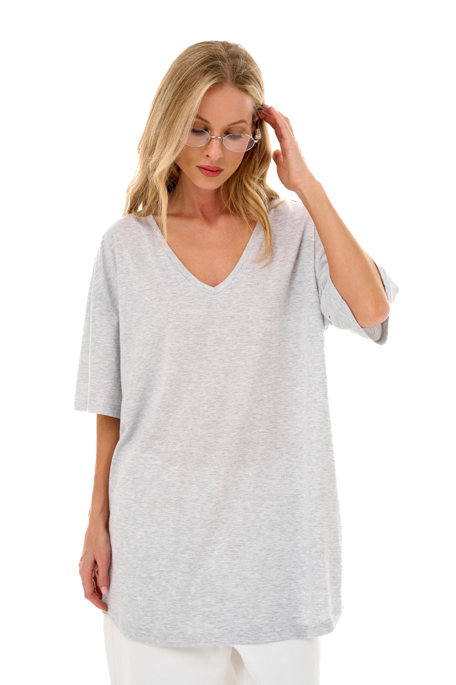 Футболка с V-образным вырезом из серого меланжа с минималистичной белой вышивкой на груди UNO MAS UNO.