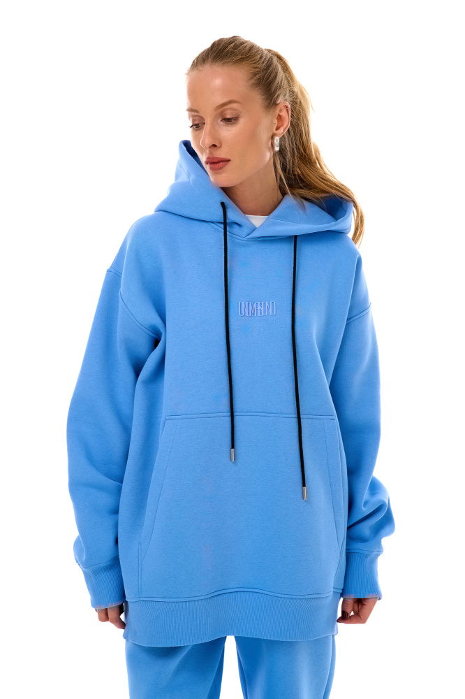 Худи оверсайз посадки в лазурном оттенке с фирменной фурнитурой и выпуклым логотипом UNO MAS UNO.