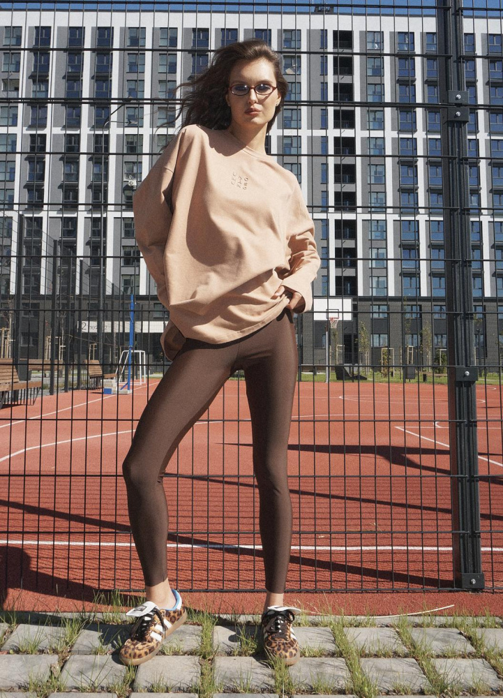 Леггинсы в шоколадном оттенке с черной брендированной резинкой.