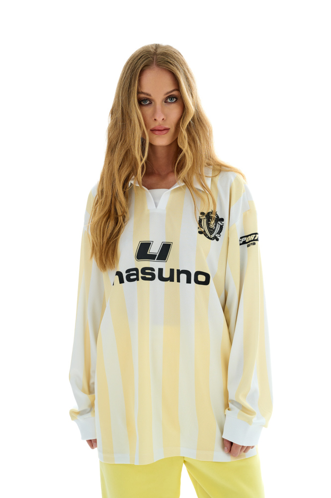Новая модель лонгслива с принтом в спортивном стиле в желтом цвете.