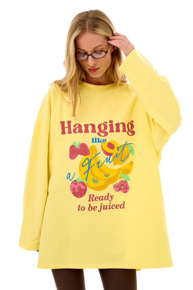 На лонгсливе написано Hanging like a Fruit, ready to be juiced.