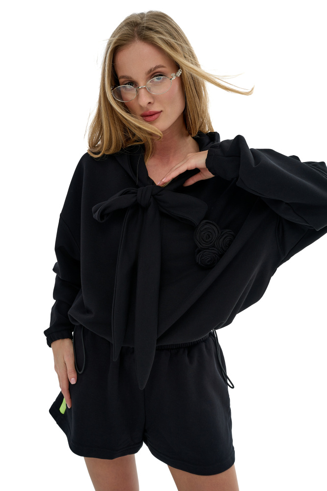 Толстовка "Банни" в черном цвете с длинными завязками и розочками ручной работы.