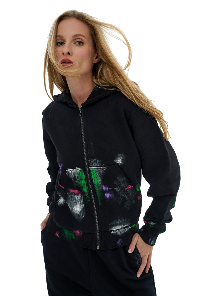 Толстовка из плотного 100% хлопка в черном цвете. Каждая толстовка обработана вручную отдельно - окрашена вручную и с эффектом "дистресс". Носите со своими любимыми джинсами или с джоггерами костюмом.