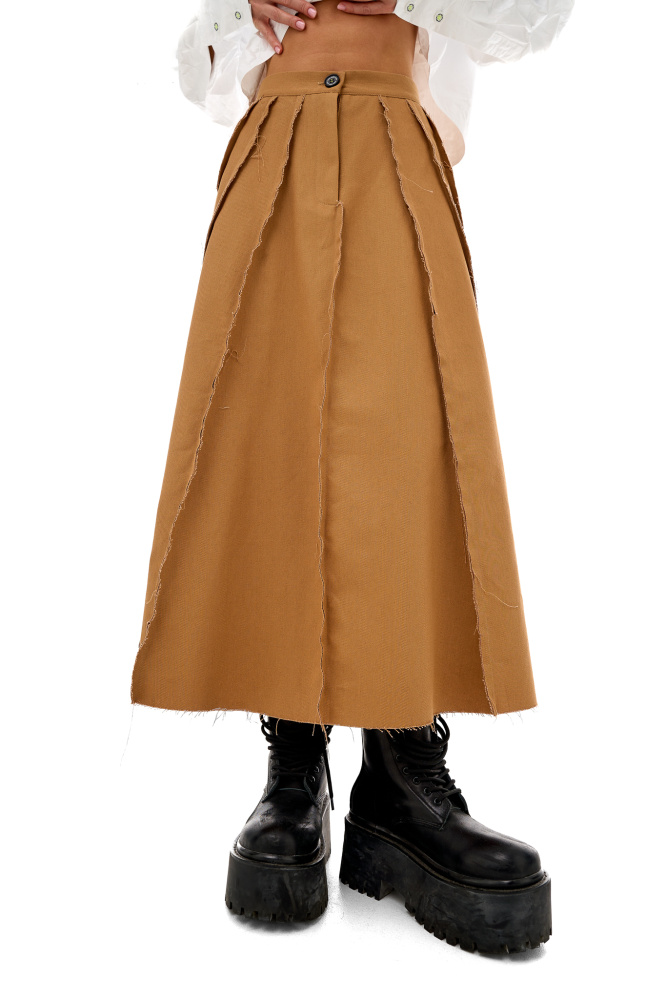 Юбка с клиньями и необработанными краями длины "макси" из хлопкового денима песочного оттенка.