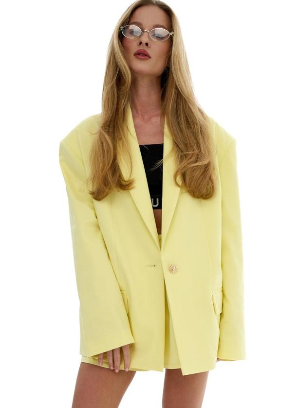 Жакет в трендовом сливочно-лимонном оттенке с золотыми пуговицами в виде ракушек. Сочетайте с бермудами, юбкой или джинсами. По-настоящему яркий образ!