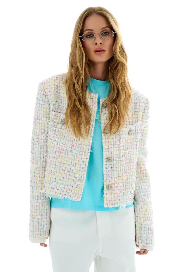 Жакет из твидового хлопка в нежно-пастельной гамме. Жакет укороченного кроя с необработанным краем.