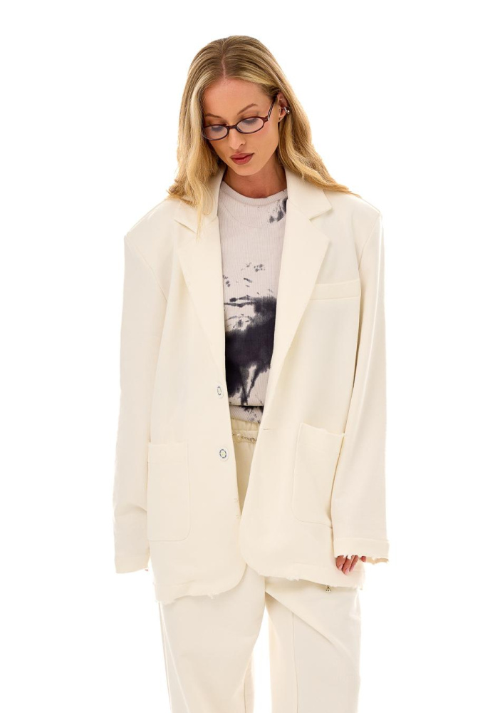 Жакет умеренной оверсайз посадки из плотного молочного хлопка с эффектом "дистресс".